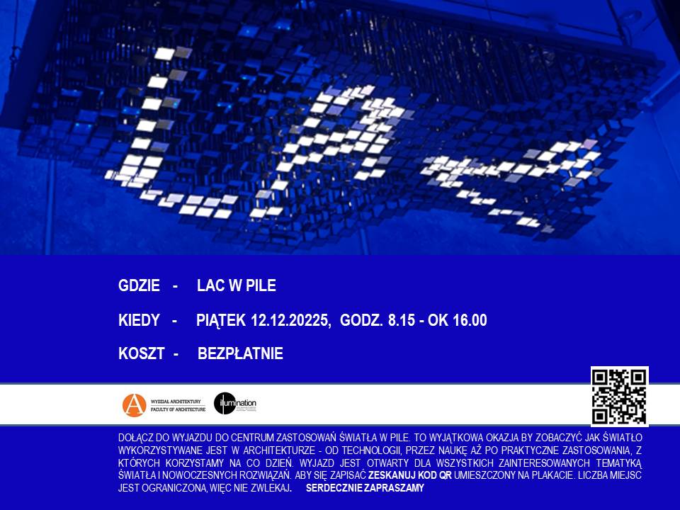 Koło Naukowe 'llumination' organizuje wyjazd autobusem do Centrum Zastosowań Światła w Pile. To wyjątkowa okazja by zobaczyć jak światło wykorzystywane jest w architekturze - od technologii, przez naukę aż po praktyczne zastosowania, z których korzystamy na co dzień. Wyjazd jest otwarty dla wszystkich zainteresowanych tematyką światła i nowoczesnych rozwiązań. Aby się zapisać zeskanuj kod QR umieszczony na plakacie. Liczba miejsc jest ograniczona, więc nie zwlekaj.